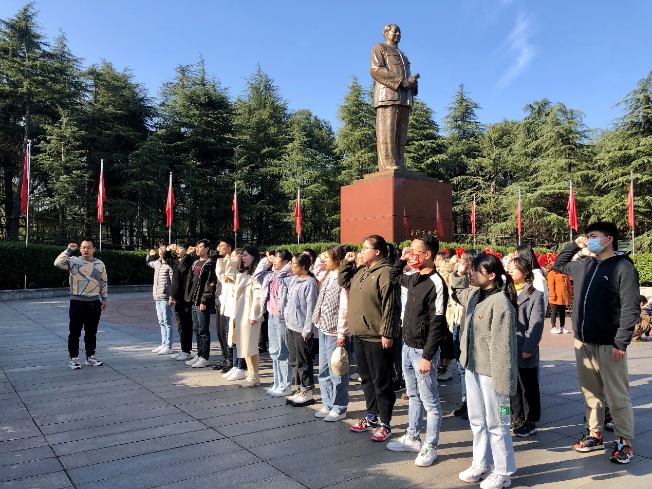 首先,全体党员来到了毛主席铜像广场。在任老师的带领下,全体党员庄严肃穆的迈着整齐的步伐走向了毛主席铜像,向毛泽东主席铜像献鲜花,真诚而又敬仰的向毛主席铜像深深地鞠躬。随后,任老师带领全体党员重温了庄严肃穆的党员宣誓。响亮宏大的宣誓声缭绕着整个广场,体现了全体党员的坚定决心。
