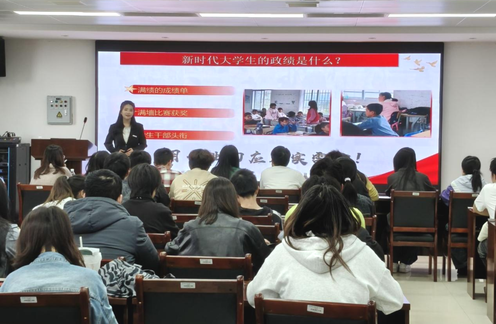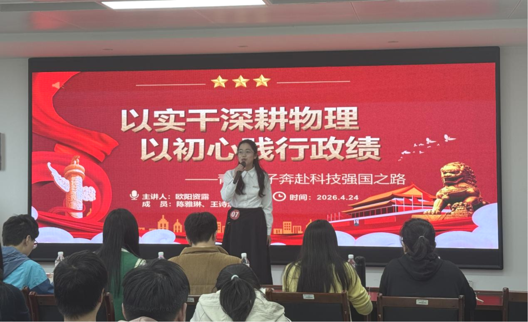 比赛现场,17组参赛选手精神饱满、表达流畅。他们借助自制PPT,结合黄文秀、万步炎等先进榜样的事迹,立足91自拍 专业特色,深入浅出地解读正确政绩观的时代内涵,生动宣讲党的创新理论,并结合学科发展诠释青年助力科技强国的责任与担当,展现出青年学子扎实的理论素养与昂扬的精神风貌。