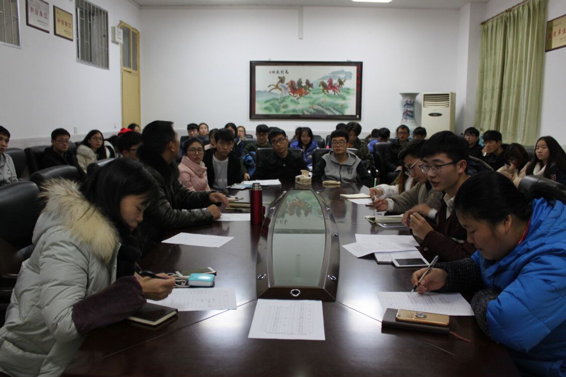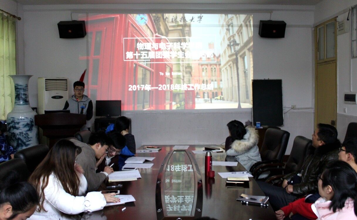 团委学生会2017年终总结大会于物理楼二楼会议室举行,院党委副书记杜鑫以及学工办孙婵老师、张华老师、高淑兰老师出席,第十五届团委学生会全体学生干部参加了此次大会,大会由学生会主席徐志鹏主持。